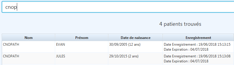 Afin de limiter le nombre de résultats, la recherche ne s’effectue qu’à partir de 2 caractères saisis. La recherche s’effectue pour chaque mot saisi et simultanément sur le nom, le prénom, l’âge ou la date de naissance et la date d’enregistrement du patient. Plus il y a de mots saisis, plus la recherche est sélective. La recherche s’effectue quel que soit la casse (majuscule, minuscule) et indépendamment des accents et caractères spéciaux. Par exemple : ‘Er’ recherche tous les noms et prénoms commençant par ‘er’ ou ‘ér’ ou ‘èr’ ou ‘êr’ ou ‘ër’.