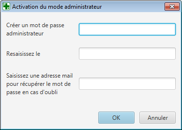 Le bouton ‘Activer’ permet de définir un mot de passe et un email de récupération pour demander l’activation du mode Administrateur.